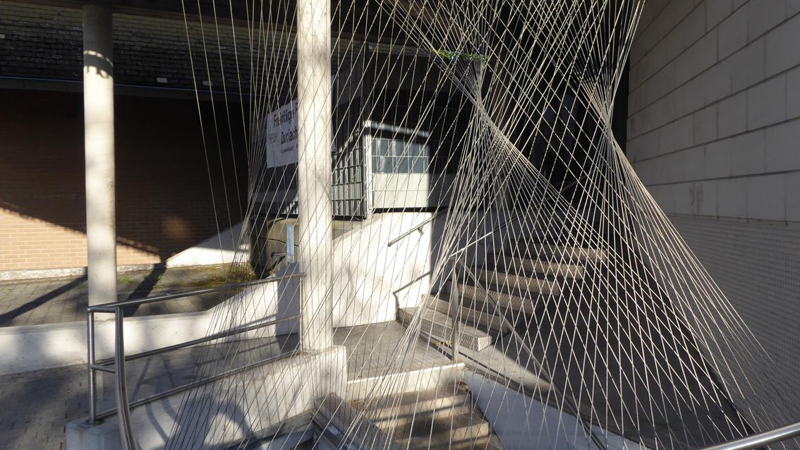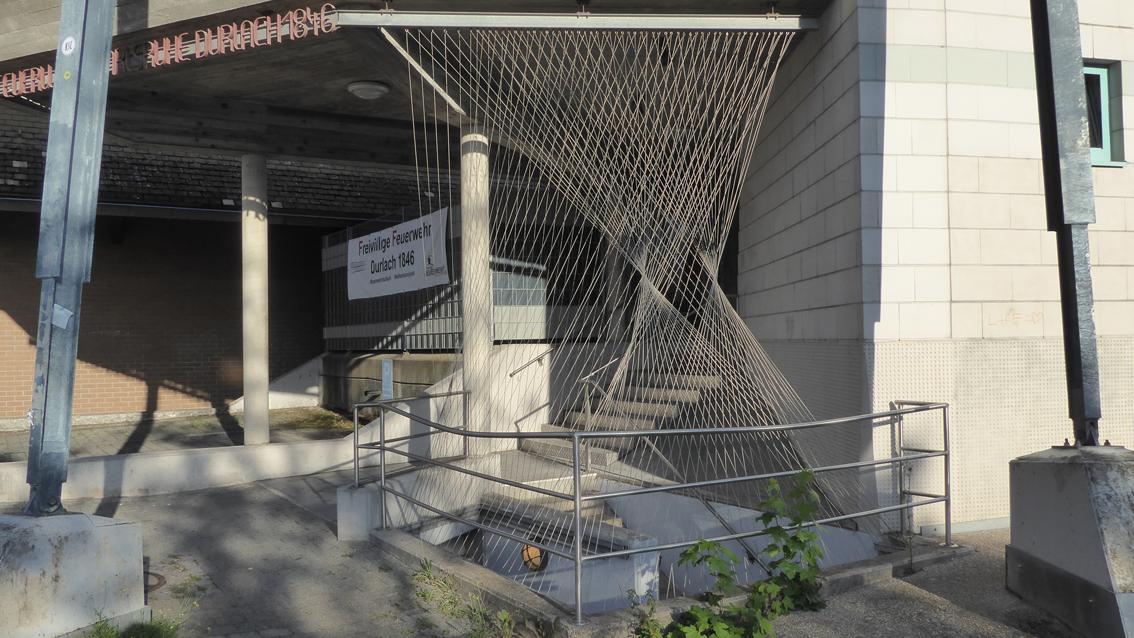 Die Künstlerin, die auch als Goldschmiedin tätig ist, versah 1992 den Zugang zur Freiwilligen Feuerwehr mit einem Gespinst aus feinen Linien. Dünne Stahlseile sind so gespannt und in Stahlschienen geführt, dass Linien sich bündeln, sich überschneiden und unterschiedlichen Verläufen folgen. Das visuelle Ergebnis steht in der Tradition flirrender Kunstwerke der Op Art der 60er Jahre des letzten Jahrhunderts. Im Jahre 2020 wurde die Installation von der Künstlerin aufwändig restauriert.