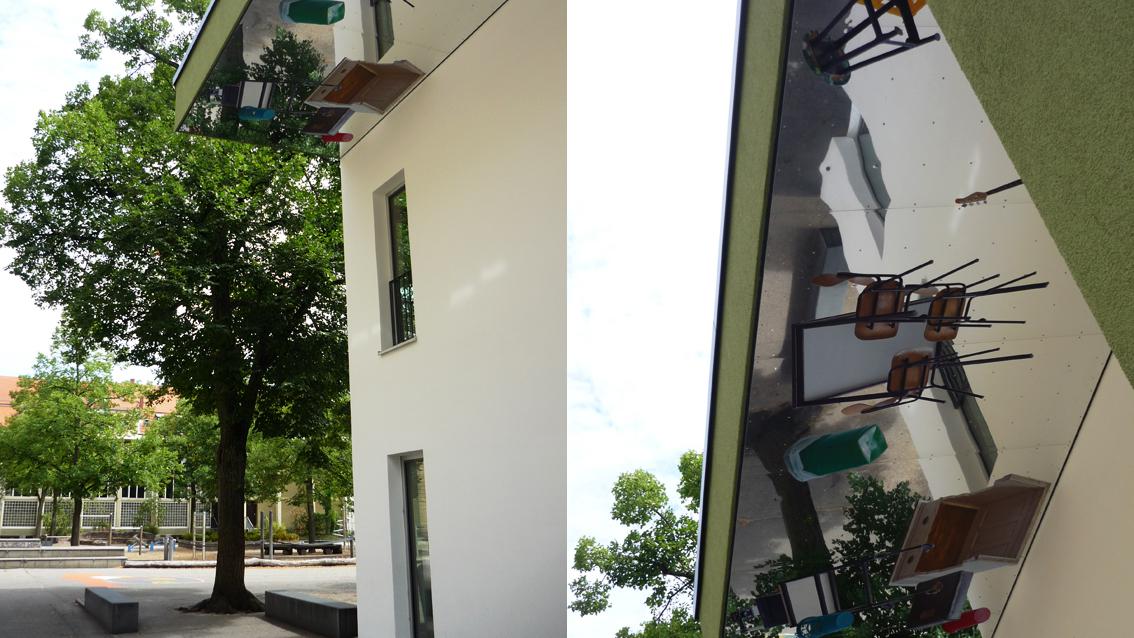 Die Arbeit der Absolventin der Staatlichen Akademie der Bildenden Künste Karlsruhe irritiert hinsichtlich des Standorts, des Inhalts und der Form. Auf einer Spiegelfläche, die an der Unterseite eines schmalen Vordachs montiert ist, sind Klassenzimmerutensilien abgebildet, die in einem imaginären Luftraum zu schweben scheinen.