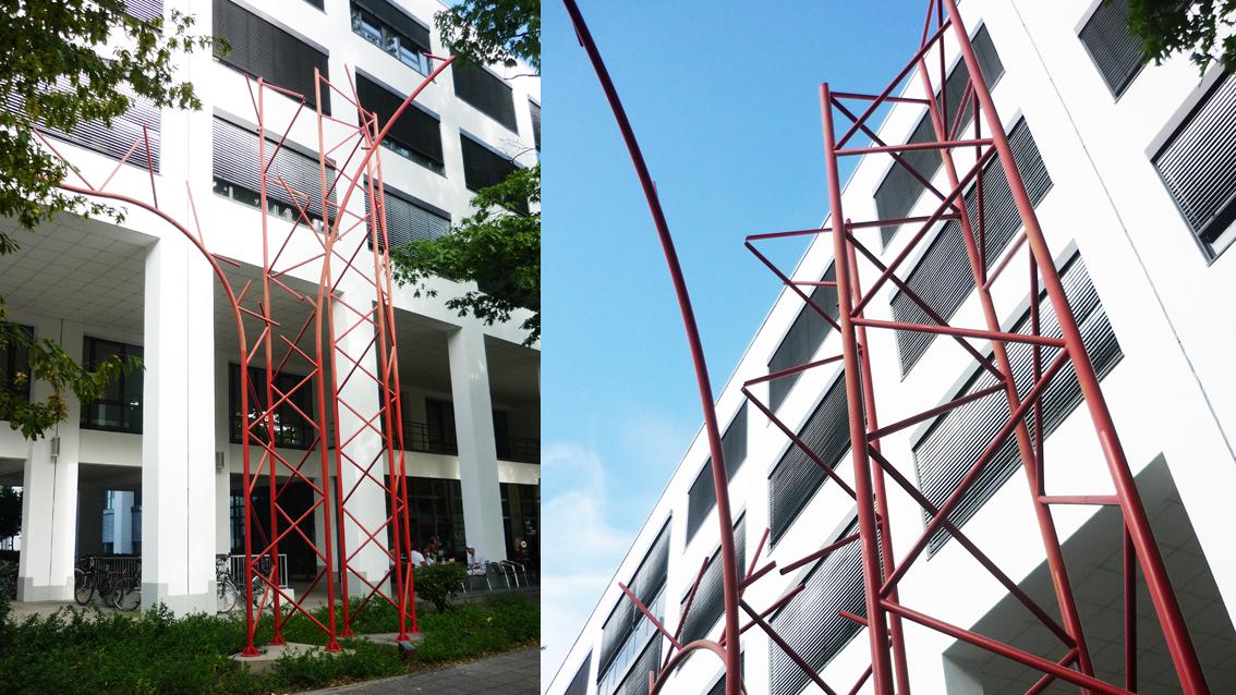 Die Plastik entstand als Kunst am Bau Beitrag für den Neubau der damaligen Berufsakademie. Zwei Einzelformen bilden einen ‚Pas de Deux‘, auf der Tanzbühne der Höhepunkt eines Balletts. Im Außenbereich der heutigen Dualen Hochschule empfangen sie Lehrende und Lernende als torähnliche, rote Zeichen, die in ihrer konstruktiven Erscheinungsform einen ungegenständlichen Kontrast zu den benachbarten Bäumen bilden.
