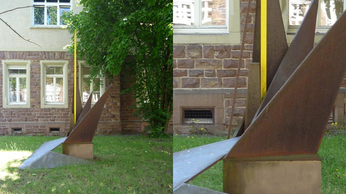 Die Stahlplastik des Bildhauers Manfred Dörner steht als dynamisches Zeichen vor dem Eingang zur Augenklinik des städtischen Klinikums. Es überwiegen spitz zulaufende Dreieckformen, denen kleinere Trapez- und Rechteckflächen zugeordnet sind. Ein gelber Stab betont die Vertikale, er gibt der stark bewegten Gesamtkomposition Stabilität und Ruhe. Naturbelassene, unterschiedlichen Richtungen folgende Stahlflächen und die präzise vertikal ausgerichtete Lichtlinie bilden einen starken Kontrast.