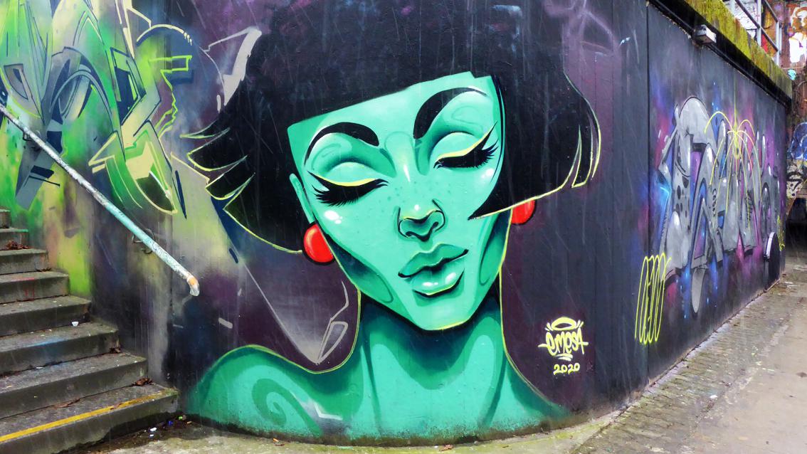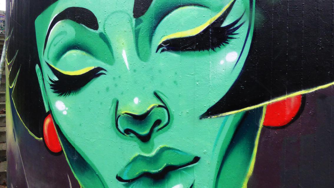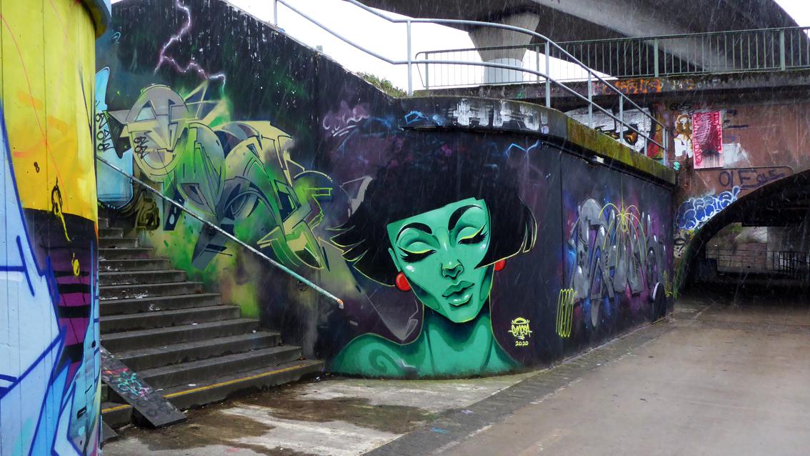 Gegenstand von Emesas Graffiti Interventionen im Karlsruher Stadtraum sind vorwiegend Porträts junger Frauen mit betontem Augen- und Mundbereich. Das monumentale Gesicht auf einer gewölbten Wandfläche entlang der Alb auf Höhe der Bahnunterführung/ Durmersheimer Straße bindet die Aufmerksamkeit der vorbei Flanierenden durch seine extravertierte Präsenz. Auf den zweiten Blick erscheint das eigentliche Antlitz wie von einer Maske überlagert, wodurch das Porträt Distanz und Nähe, Offenheit und Verschlossenheit zugleich ausstrahlt. Aktuell (2021) studiert Emesa, die eigentlich Marija Silvija Ambrazeviciute heißt, an der Staatlichen Akademie der Bildenden Künste in Karlsruhe. Geboren wurde sie in Litauen, aufgewachsen ist sie in London und im Schwarzwald, nun lebt und arbeitet sie im badischen Karlsruhe.
