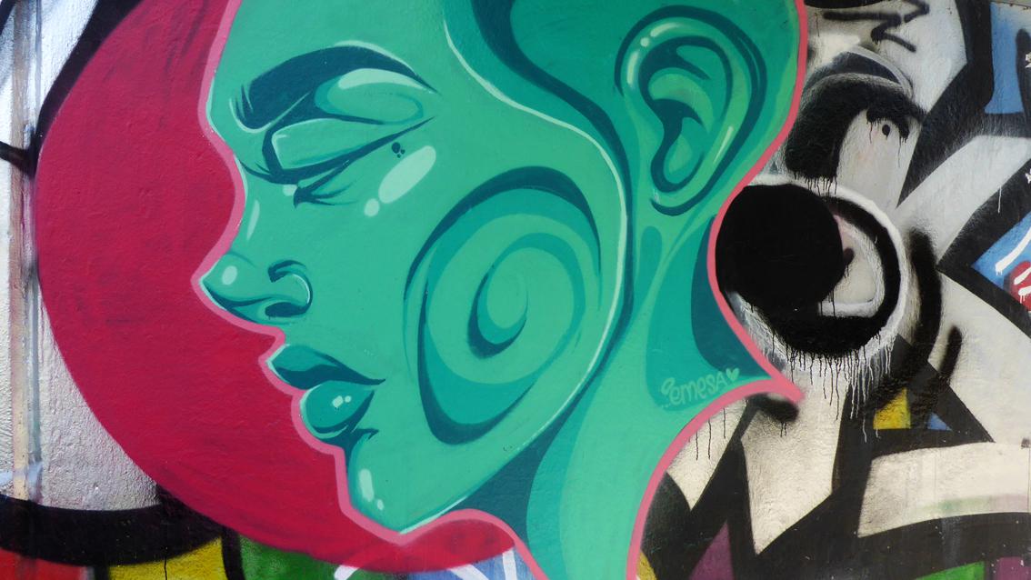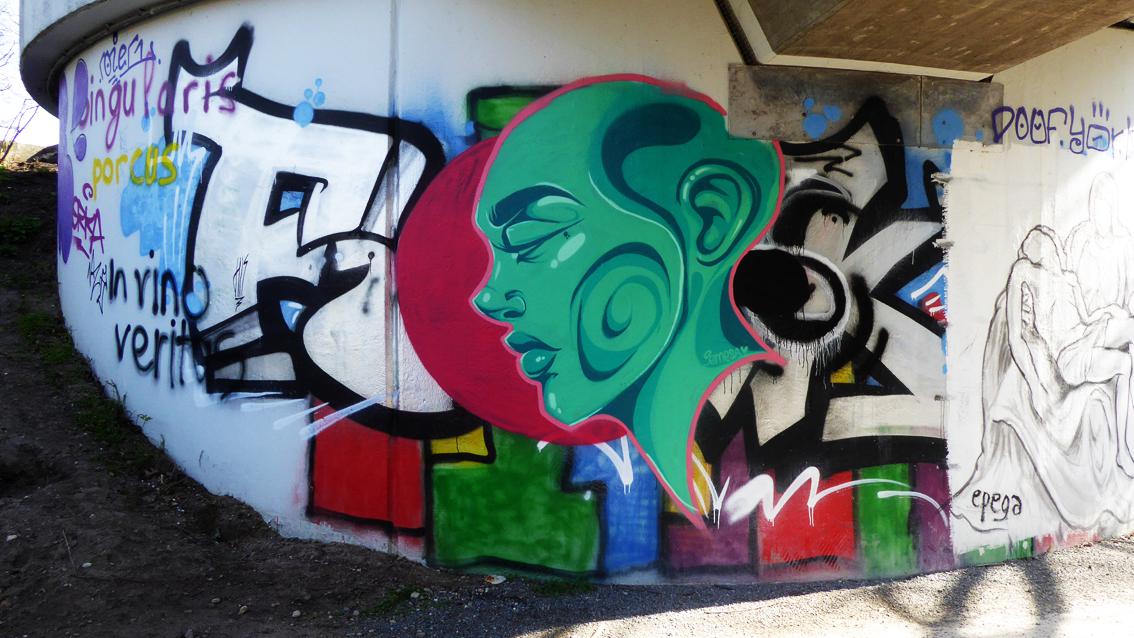 Gegenstand von Emesas Graffiti Interventionen im Karlsruher Stadtraum sind vorwiegend ausdruckstarke Porträts. Das monumentale Bildnis einer jungen Frau an der gewölbten Wand am nördlichen Pfeiler einer Albüberbrückung für Fußgänger und Fahrradfahrer auf Höhe des Europabades, ist in einem leuchtenden Türkis vor einem pinkfarbenen Hintergrund ausgeführt. Stand 2021 studiert Emesa, die eigentlich Marija Silvija Ambrazeviciute heißt, an der Staatlichen Akademie der Bildenden Künste in Karlsruhe. Geboren wurde sie in Litauen, aufgewachsen ist sie in London und im Schwarzwald, aktuell lebt und arbeitet sie in Karlsruhe.