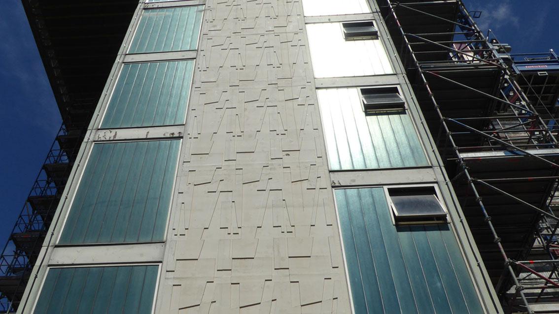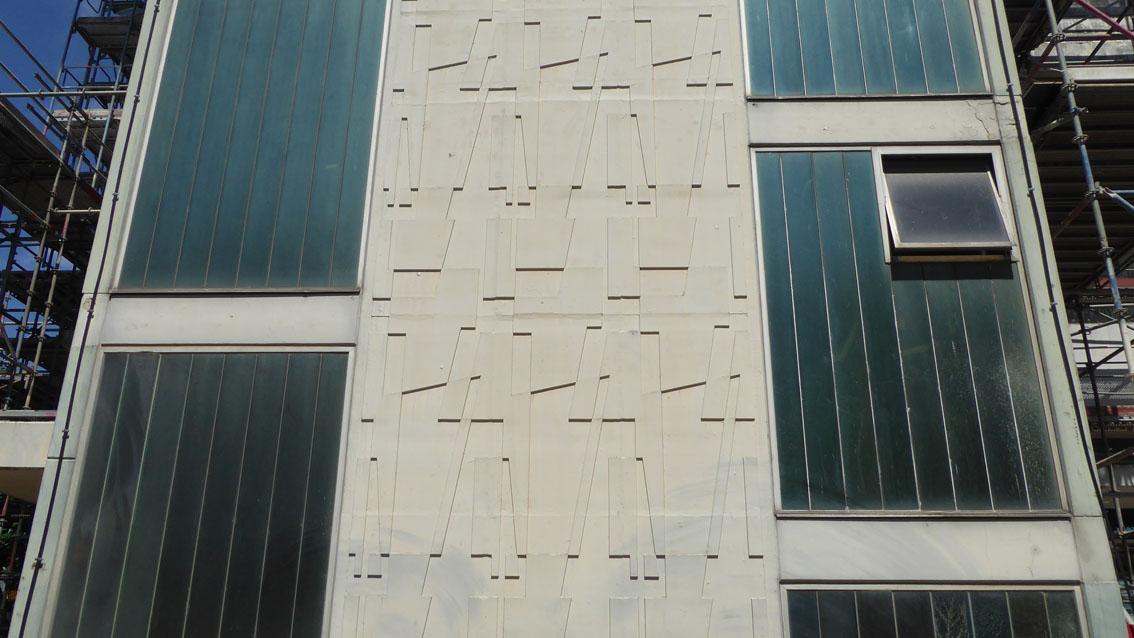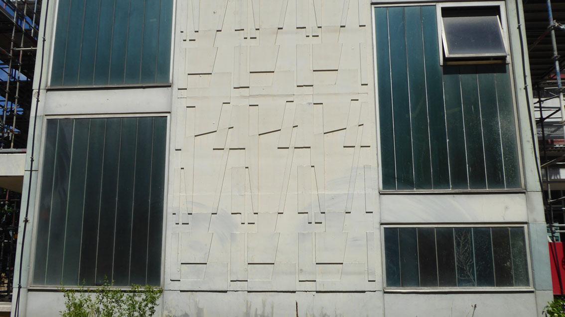 Der Künstler arbeitete schwerpunktmäßig im Bereich Kunst am Bau. Zu seinem Freundeskreis zählten Architekten und Künstler, wie Heinz Mohl, Erwin Spuler oder Herbert Kitzel. Bei Prof. Kitzel war er Gaststudent an der Staatlichen Akademie der Bildenden Künste in Karlsruhe. Wichtige bildhauerische Impulse verdankte er Erwin Spuler. Trust wurde 1926 in Karlsruhe geboren und verstarb im Jahre 1986 in Baden-Baden. Für die Heinrich-Hertz-Schule entwickelte der Bildhauer und Grafiker eine Fassadengestaltung an der Südseite des sechsstöckigen Gebäudes. Das großflächige Kunstwerk wurde in einer ungegenständlichen Formensprache in der Tradition der geometrischen Abstraktion ausgeführt. Horizontale, vertikale und schräge Linien- bzw. Formverläufe sind reliefartig hervorgehoben und ergeben vor allem bei Sonneneinstrahlung ein kontrastreiches Licht- und Schattenspiel.