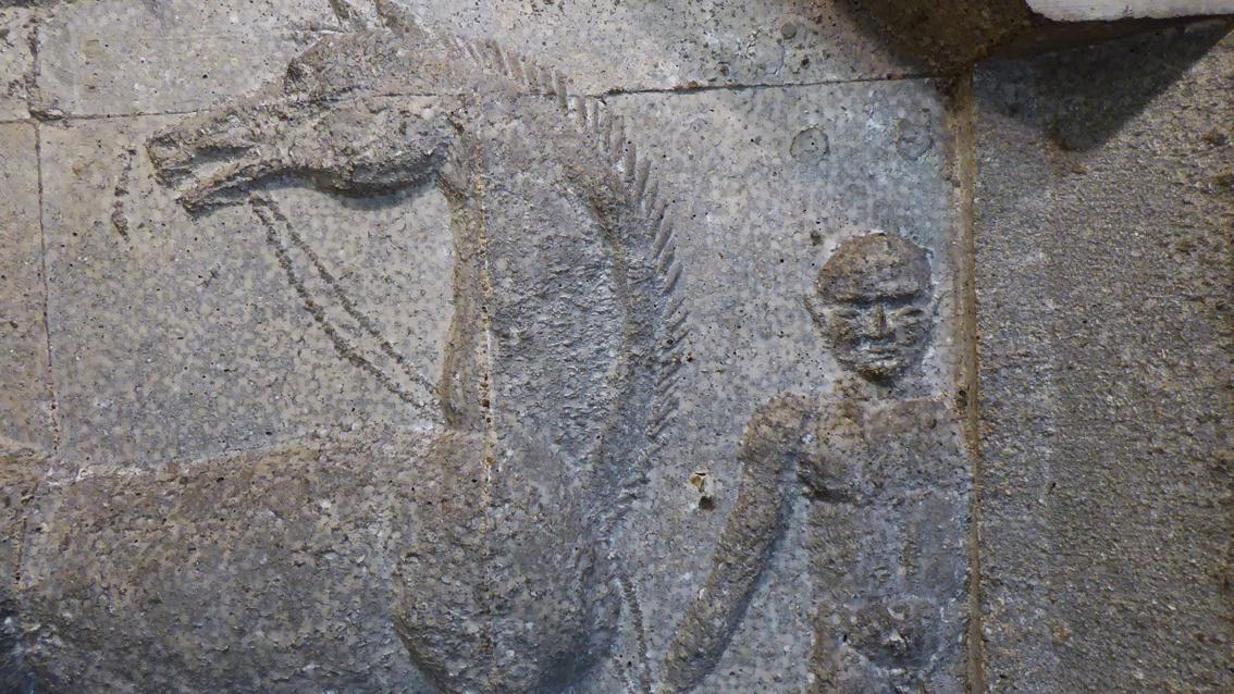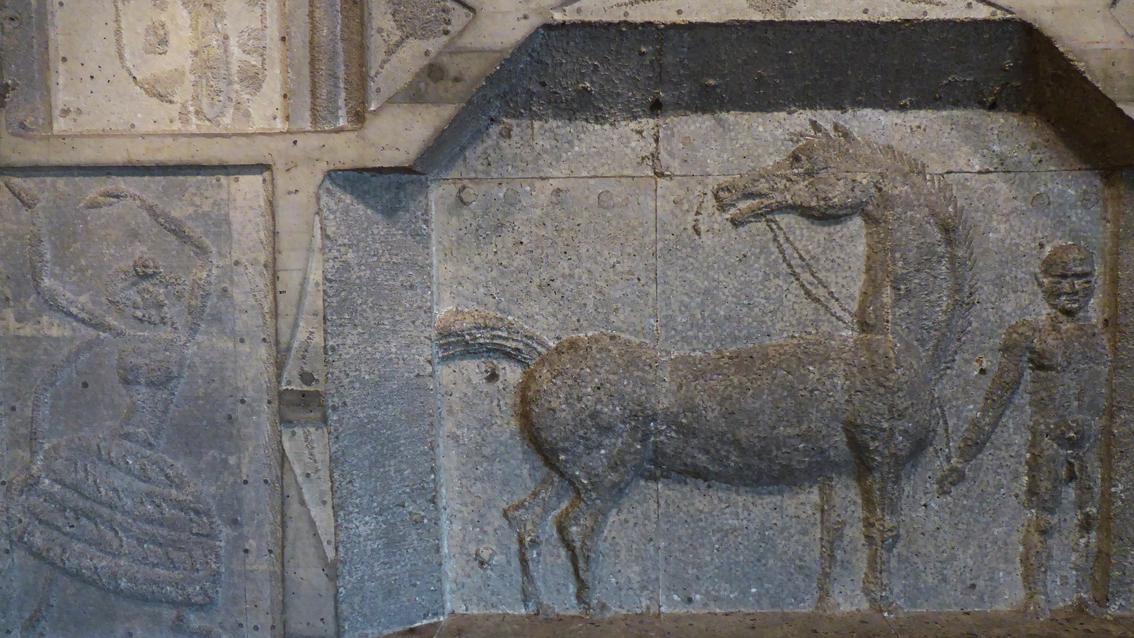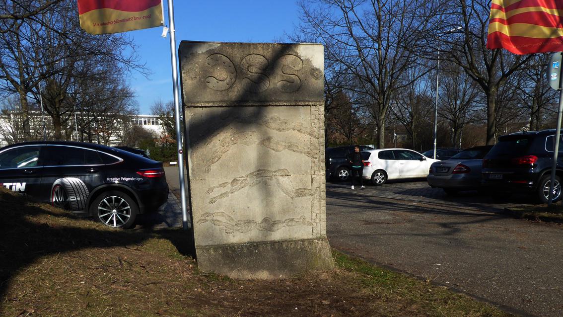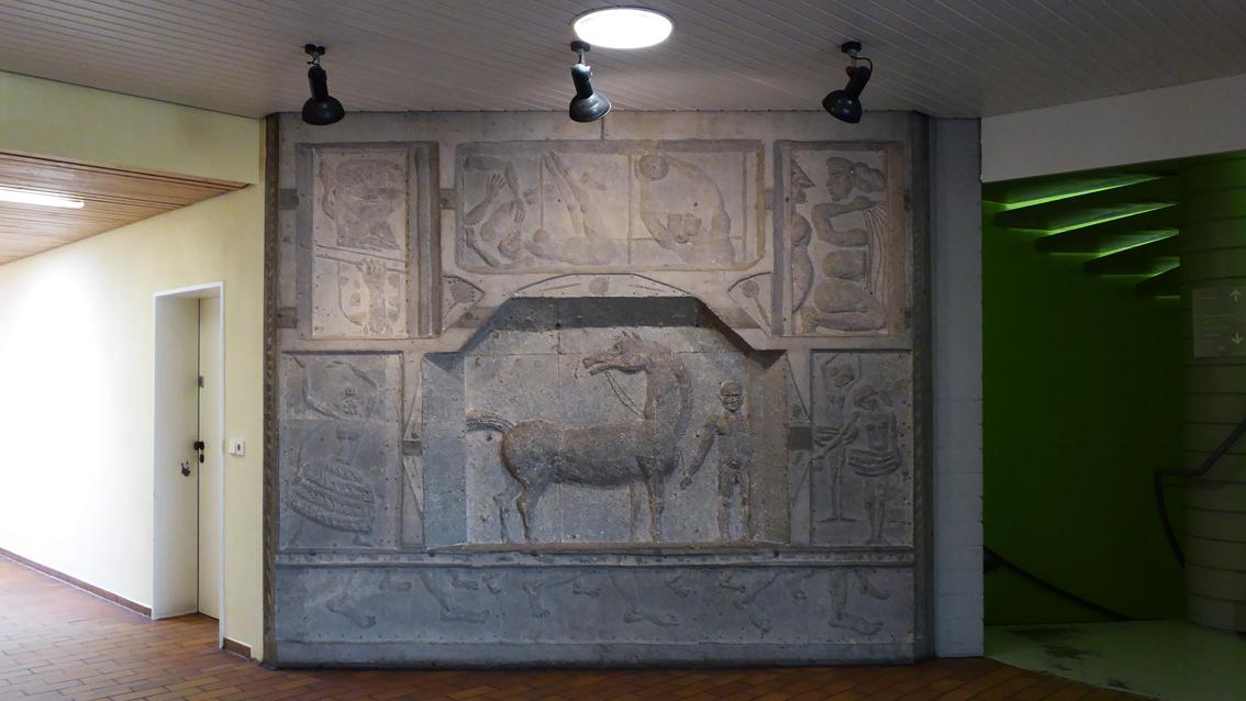 Emil Wachter studierte zunächst Theologie und Philosophie an der Universität Freiburg, danach bis 1954 Malerei und Bildhauerei an der Staatlichen Akademie der Bildenden Künste Karlsruhe. Zwischen 1958 und 1963 lehrte er an dieser Einrichtung. Der Künstler wurde 1921 in Neuburgweier geboren und verstarb am 12. Januar 2012 in Karlsruhe. Wachter gestaltete neben vielen Sakralgebäuden auch Brunnen und Reliefs im öffentlichen und privaten Raum. Im Jahre 1979 fertigte er für die Eingangshalle des Begegnungszentrums des SSC Karlsruhe ein großflächiges Relief aus Beton, einem damals von Künstlern entdeckten, modernen Werkstoff. Auf unterschiedlichen Bildfeldern sind in einem für den Künstler typischen Erzählstil vor allem Menschen dargestellt, die unterschiedliche Sportarten ausüben. Das Zentrum dominiert ein Pferd, das den Blick über den verdrehten Kopf auf eine mehrarmige, ganz dem Tanz hingegebene junge Frau richtet. Im Außenbereich befindet sich eine Betonstele mit einem SSC Schriftzug in Spiegelschrift. Darunter verweisen ins Wasser hechtende Wassersportler auf das benachbarte Fächerbad. Der skurrile Figurenstil des Reliefs und die Besonderheiten der Stele lassen den Schalk im Künstler überzeugend aufblitzen.
