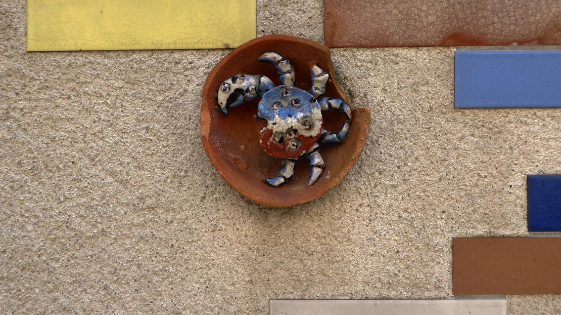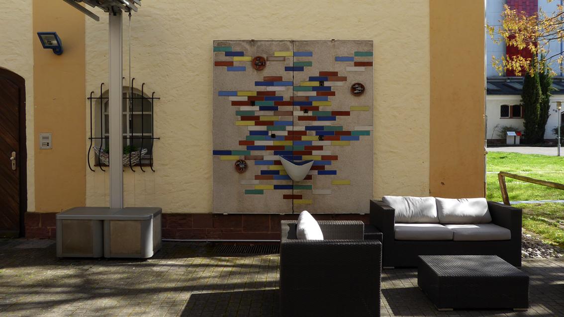Das Relief wurde in der Staatlichen Majolika Manufaktur Karlsruhe gefertigt und ist mit der vereinfachenden Formensprache und der Vorliebe für aufgehellte Grundfarben ein typisches Beispiel der Kunst der 50er Jahre des vergangenen Jahrhunderts. Der gekachelten Wand sind kleine figürliche Reliefs, die unter anderem Fische und Krebse zeigen und ein kleines Becken in Nierenform zugeordnet.