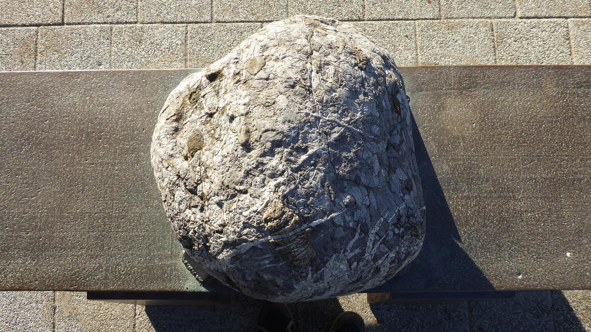 Das Kunstwerk des Schweizer Bildhauers (1924-2009) lädt gleichermaßen zum Betrachten und zum darauf Sitzen ein. In der Mitte der aus patinierter Bronze gefertigten Bank befindet sich ein Stein, vom Künstler gefasst und zur Schau gestellt wie ein wertvolles Schmuckstück eines Goldschmieds. Die amorphe, unregelmäßige Textur des Steins entstand mittels Veredelung durch Magma: Seit 1976 bestieg Bucher Vulkane, um seine Werke vor Ort mit Lava weiter zu bearbeiten. Die Plastik befand sich bis 2008 auf der Karlsruher Kaiserstraße, war danach zwischengelagert und befindet sich seit Oktober 2025 im Skulpturenpark Wettersbach.