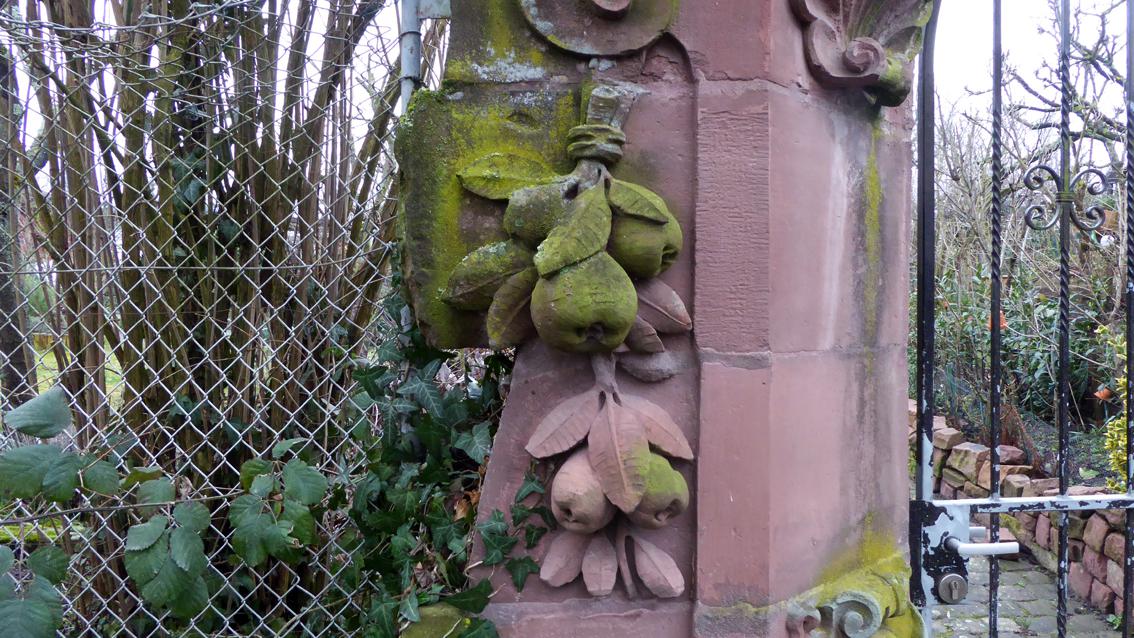 Das historische Architekturfragment verweist als markantes Zeichen aus Naturstein auf die dahinter liegende Anlage der ‚Gartenfreunde im Albgrün‘. Das Tor ist aus unregelmäßigen Quadersteinen gefügt, der Bauschmuck besteht aus Stabwerk, Muschelelementen, Früchtestillleben und Wappen mit Zierrahmen. Es ist der Epoche des Historismus zuzuordnen, als Architekten im Übergang vom 19. ins 20. Jahrhundert vorausgegangene Stilrichtungen zitierten. Vor allem die mit Moos und Flechten überzogenen Früchte erscheinen zum Greifen nah. Das Portal stammt aus dem Gaststättenkomplex ‚Kühle Krug‘, der im Jahre 1898 eröffnet worden war. Der Bauherr wollte neben einem Biergartenlokal mit Saal und Musikpavillon einen extra Gastraum haben, um die Arbeiter der naheliegenden Brauerei Sinner und der Reißwolle- sowie Spiritusfabriken in Grünwinkel zu bewirten. Planer der gastronomischen Anlage war der angesehene Architekturprofessor Carl Schäfer, der in Karlsruhe zudem die Altkatholische Kirche entwarf. Dem Architekturbüro Heinz Jakubeit ist es zu verdanken, dass das Sandsteinportal nach dem Abriss der alten Gaststätte erhalten blieb, im städtischen Bauhof zwischengelagert und im Jahre 1976 am jetzigen Standort wieder aufgerichtet wurde.