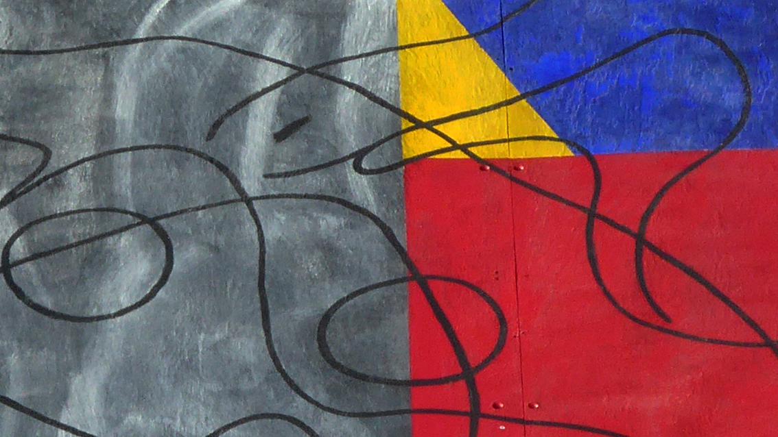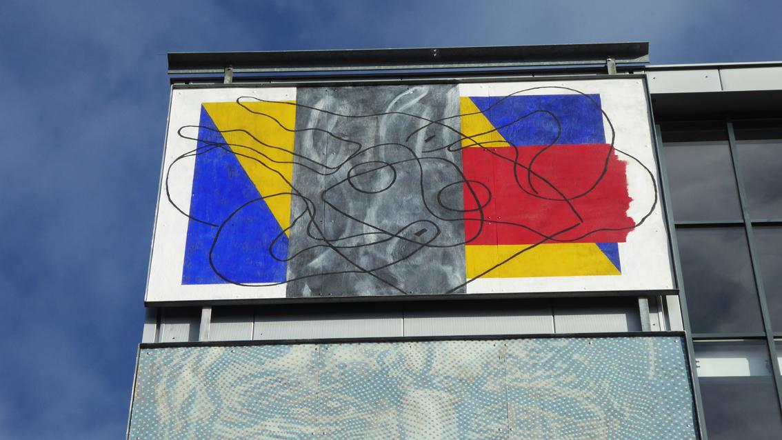 Der Maler ist Mitglied des Künstler*innenvereins ‚PlakatWandKunst‘. Seit Jahren ist diese Gruppe in der Stadt Karlsruhe, in der Region und darüber hinaus mit temporären Aktionen im öffentlichen Raum aktiv. Verbindendes Konzept ist, dass die individuellen, künstlerischen Ideen auf Holzplatten und in dem Format 260 cm auf 360 cm verwirklicht werden. Die Träger der Raumfabrik haben Werke einzelner Künstler*innen der Gruppe in den vergangenen Jahren erworben und an verschiedenen Stellen der Gebäude des Anwesens fest installiert. Walter Jungs Bild aus dem Jahre 2008 besteht aus drei Ebenen. Der Hintergrund ist bestimmt von einer horizontal angelegten Farbfeldmalerei, der Mittelgrund von einer vertikalen Fläche in malerischem Grau und der Vordergrund von einer schwungvollen Pinselzeichnung. Der Künstler wurde 1955 in Heidelberg geboren, von 1975 bis 1981 studierte er an der Staatlichen Akademie der Bildenden Künste in Karlsruhe. Er lebt und arbeitet in Wintzenbach (Elsass) und in Karlsruhe.