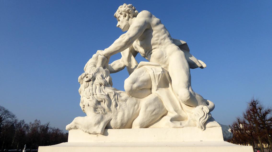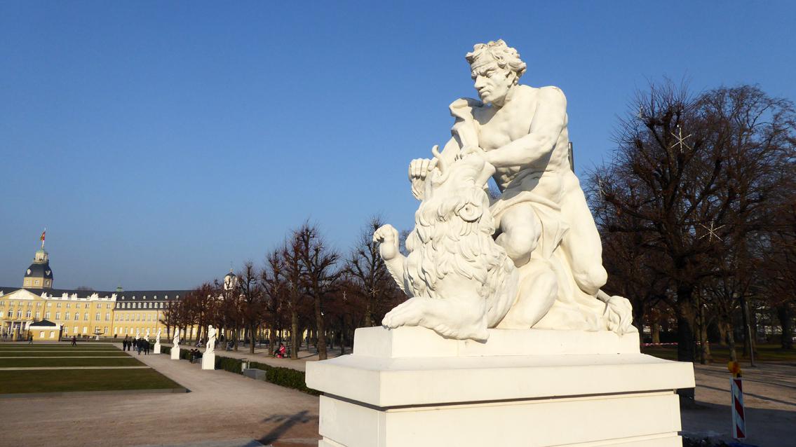 Die Menschen-Tier-Gruppe "Simson mit dem Löwen" ist eine im Jahre 1979 gefertigte Kopie aus Epoxydharz, die witterungsbedingt das Original des barocken Bildhauers Ignaz Lengelacher ersetzte. Der Künstler, der von 1698 bis 1780 lebte, entwickelte im Auftrag von Karl Friedrich von Baden bis 1764 das spätbarocke Skulpturenprogramm für den Schlossplatz. In kraftvoller Dynamik ringt Simson den Löwen nieder. Als Auserwählter Gottes gilt Simson als unbesiegbar, solange sein Haupthaar ungeschoren bleibt. Die Plastik befindet sich am südlichen Ende des Schlossplatzes.