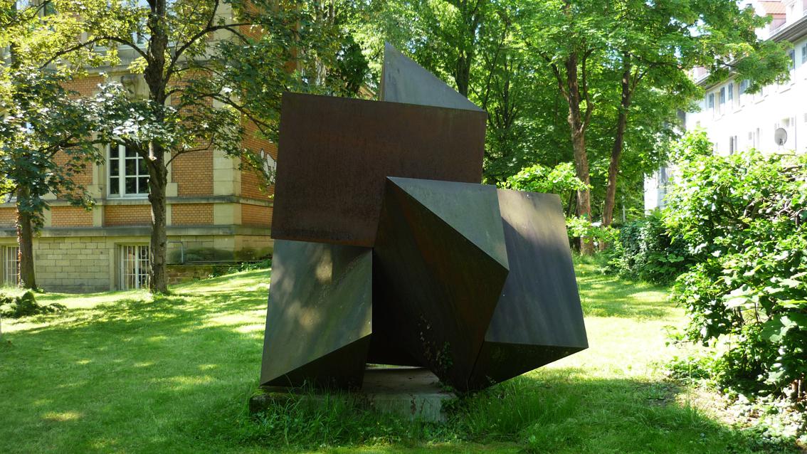 Den größten Bekanntheitsgrad haben Lederbogens Entwürfe für Briefmarken und Münzen. Seit den frühen 60er Jahren des letzten Jahrhunderts lehrte er die Grundlagen der Gestaltung an der Architekturfakultät der Technischen Hochschule Karlsruhe, dem heutigen KIT. 1969 entwickelte der Künstler, Designer und Wissenschaftler seine Skulptur aus elementaren, stereometrischen Formen. Plane Flächen, klare Linienverläufe und ein unspektakulärer Werkstoff bestimmen das Kunstwerk. Rolf Lederbogen am 4. Juni 2012 in Heidelberg.