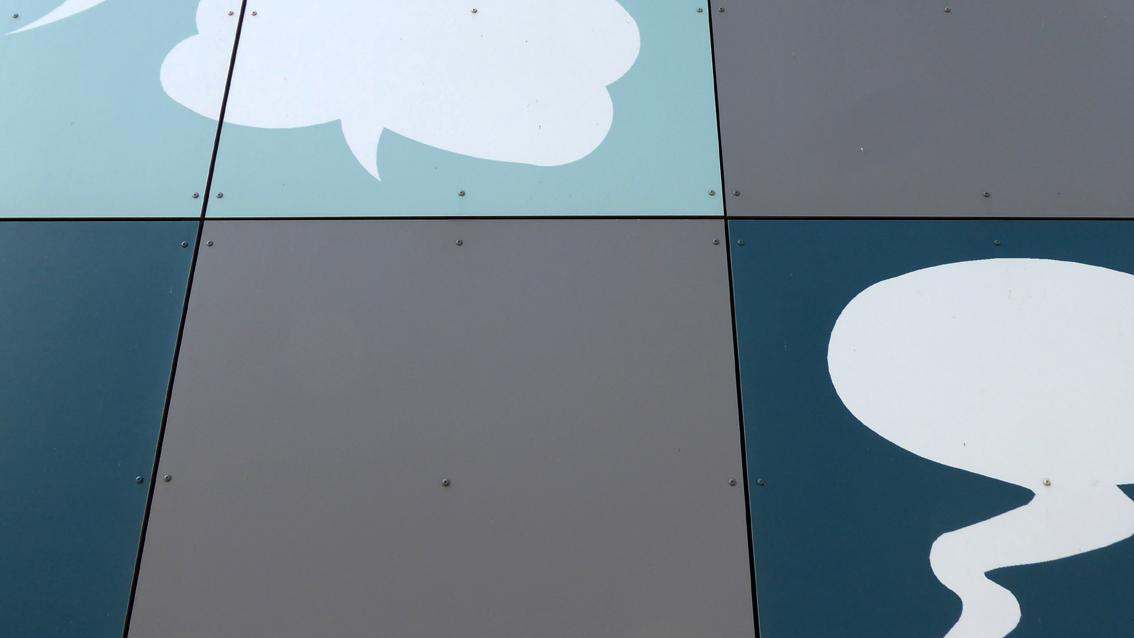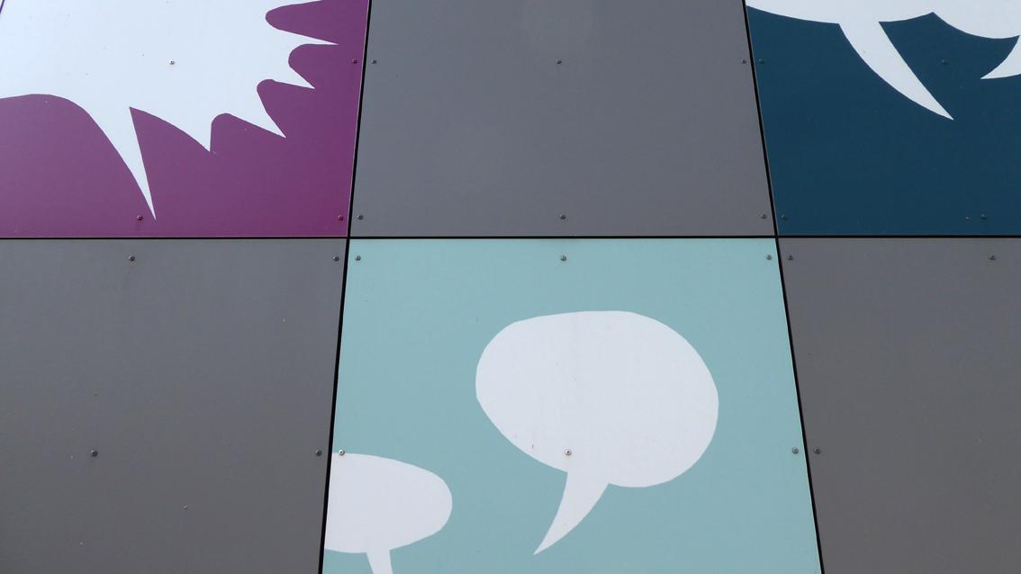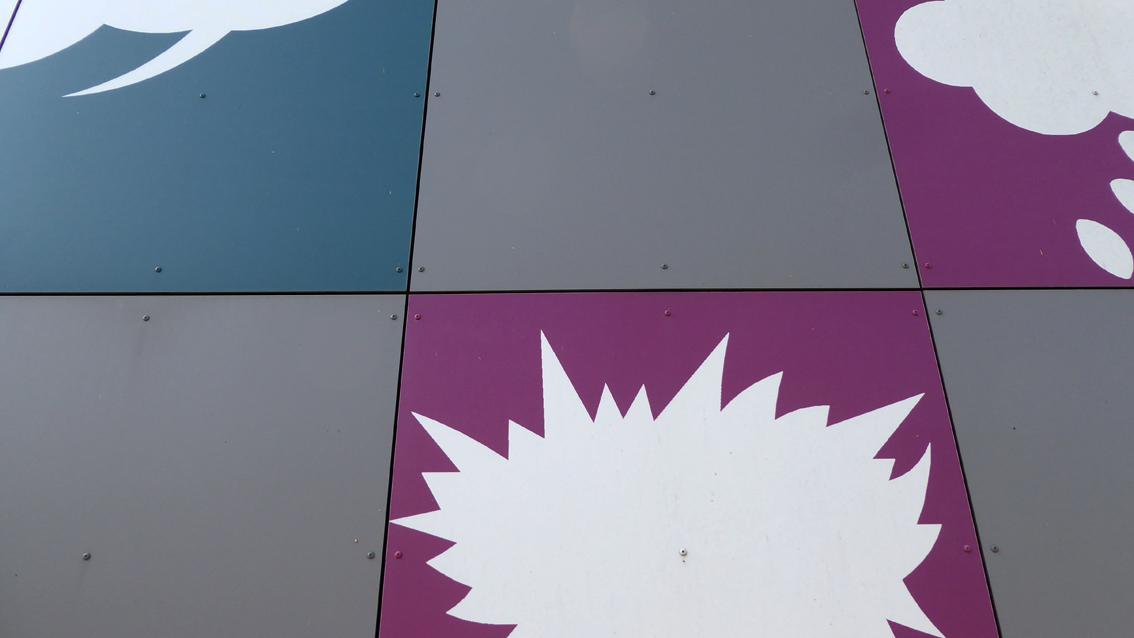 Grötzingen ist der östlichste Stadtteil von Karlsruhe. Dort befindet sich in der Eisenbahnstraße, Ecke Büchelbergstraße, seit 2009 das Kinder- und Jugendhaus. Das von außen geschlossen und funktional wirkende Gebäude besitzt nach Osten hin eine über jeweils ein Quadratmeter große Platten gerasterte Fassade. Die drei oberen, ca. drei auf elf Meter großen Streifen wurden von der Grötzinger Künstlerin Brigitte Nowatzke-Kraft mit eingängigen Motiven und ausdrucksstarken Farben gestaltet. Nach Beratung mit den Kindern und Jugendlichen vor Ort kam die Künstlerin zu der Entscheidung, vierzehn Fundermax Exterior Fassadenplatten mit ‚Sprechblasen ohne Inhalt‘ zu versehen. Diese sollten vor dem Hintergrund einer stetig sich wandelnden Wirklichkeit mit immer wieder neuen Inhalten gefüllt werden können. Die Sprechblasenmotive wurden als Siebdruck in Weiß, See- und Petrolgrün sowie Cyclamrot auf die Platten aufgetragen. Brigitte Nowatzke-Kraft studierte von 1969 bis 1974 Malerei an der Staatlichen Akademie der Bildenden Künste in Karlsruhe. Im Jahre 2010 wurde sie mit dem Kunstpreis der Stadt Baden-Baden und der Gesellschaft der Freunde Junger Kunst ausgezeichnet.
