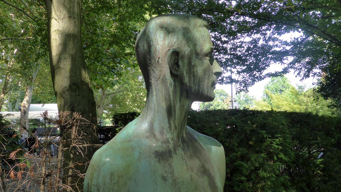 Die aufrecht stehende Figur eines nackten, jungen Mannes, dessen Blick nach links gerichtet ist und der in der rechten Hand einen Stein hält, befindet sich am westlichen Ufer des Sees, nahe der Seebühne. Der Künstler verzichtet auf einen ins Detail gehenden Naturalismus zugunsten der Darstellung einer schutzlosen Figur im Zustand körperlicher Anspannung angesichts einer möglichen Bedrohung. Tauchers Steinwerfer wurde im Jahre 1948 von der Stadt Karlsruhe angekauft und im Zoologischen Stadtgarten aufgestellt. Der Bildhauer wurde 1873 in Nürnberg geboren. Von 1900 bis 1905 war er Schüler von Hermann Volz an der Karlsruher Kunstakademie. Am 13. Januar 1950 verstarb er in Karlsruhe.