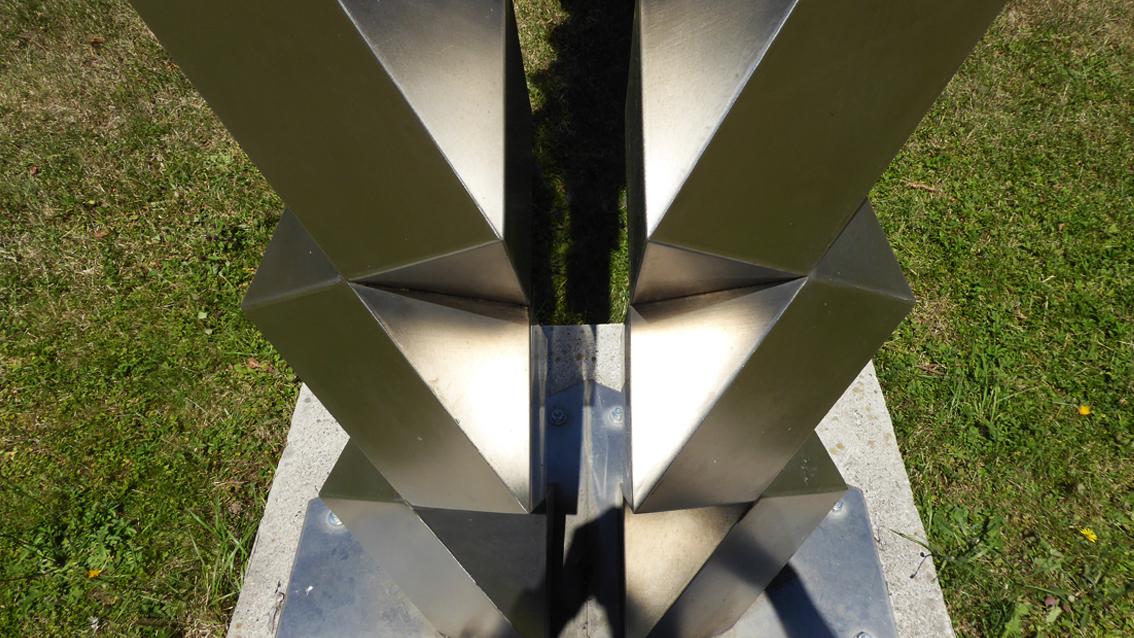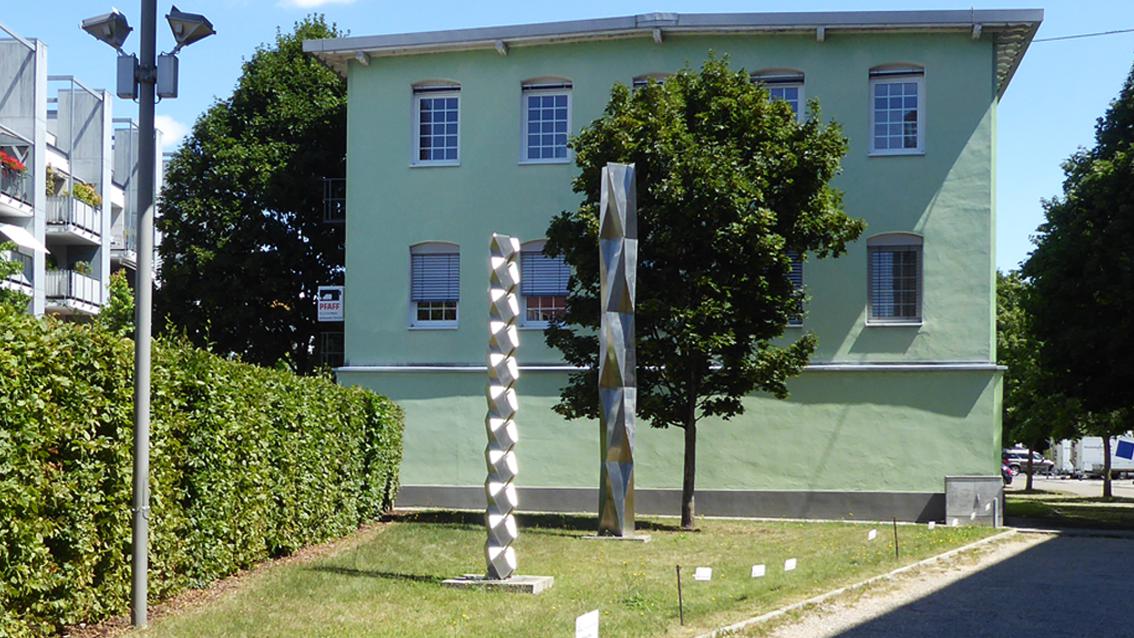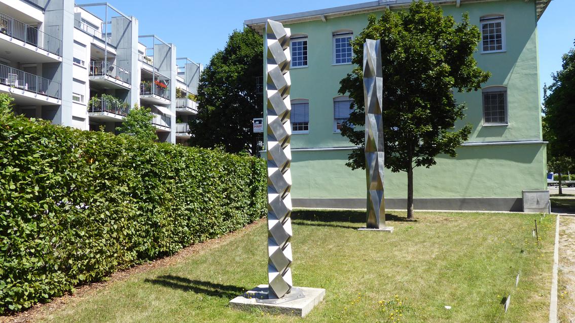 Zwischen 1994 und 2004 beschäftigte sich David D. Lauer mit Modulsäulen. Dabei wurden Teilformen übereinandergesetzt, die auf geometrischen Grundformen basieren. Bei der knapp vier Meter hohen Plastik an der westlichen Begrenzung der Raumfabrik, bilden zwei Stelen aus jeweils elf Modulen eine dynamisch sich in die Höhe entwickelnde Gesamtform. Der polierte V2R-Stahl reflektiert das Tageslicht, wodurch die Strahlkraft des Säulenpaares gesteigert wird. Der Künstler wurde am 9. Mai 1939 in Trier geboren. Nach einer Zimmermannslehre studierte er zwischen 1961 und 1967 an der Kunstakademie in Karlsruhe Bildhauerei bei Prof. Hans Kindermann, dessen Meisterschüler er wurde. Von 1974 bis 2004 hatte der Bildhauer und Zeichner an der Staatlichen Akademie der Bildenden Künste in Karlsruhe eine Professur für Projekte im Raum inne. David D. Lauer verstarb am 7. Januar 2014 in Gleisweiler.