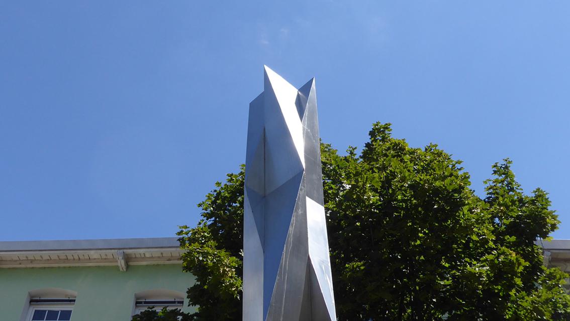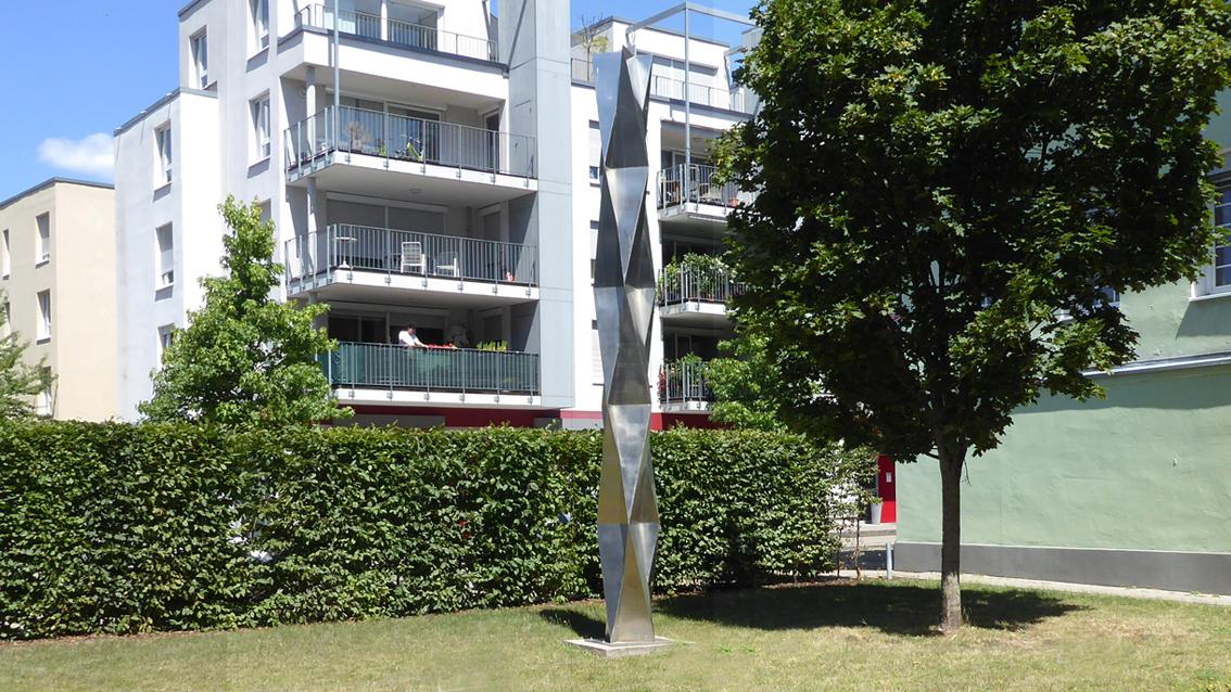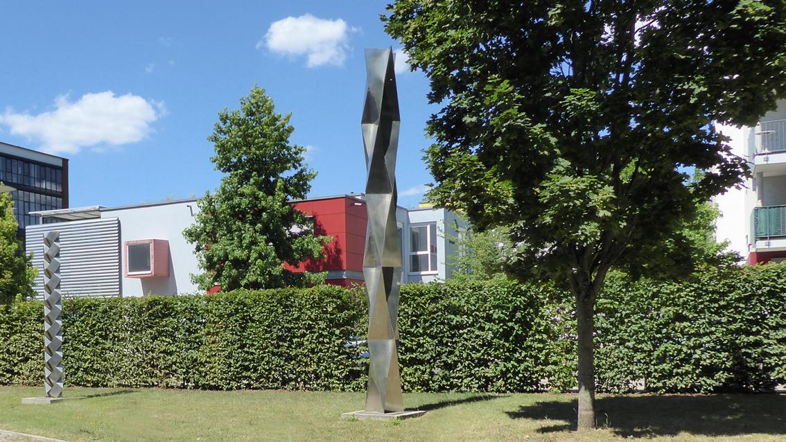 Zwischen 1994 und 2004 beschäftigte sich David D. Lauer vorrangig mit Modulsäulen. Es entstand eine Versuchsreihe kleiner Holzmodelle, von denen einige für den Außenbereich in Edelstahl oder verzinktem Stahl verwirklicht wurden. Dabei setzte der Künstler räumliche Segmente übereinander, die auf geometrischen Grundformen basieren. Bei der sechs Meter hohen Plastik an der westlichen Begrenzung der Raumfabrik, bilden fünf Module, die spiegelbildlich übereinander lagern, eine die Vertikale betonende Einheit. Der polierte V2R-Stahl reflektiert das Tageslicht, wodurch die Lebendigkeit des Kunstwerks zusätzlich gesteigert wird. Der Bildhauer und Zeichner wurde am 9. Mai 1939 in Trier geboren. Nach einer Zimmermannslehre studierte er zwischen 1961 und 1967 an der Kunstakademie in Karlsruhe Bildhauerei bei Prof. Hans Kindermann, dessen Meisterschüler er wurde. Von 1974 bis 2004 hatte der weit über die Region hinaus wirkende Künstler an der Staatlichen Akademie der Bildenden Künste in Karlsruhe eine Professur für Projekte im Raum inne. David D. Lauer verstarb am 7. Januar 2014 in Gleisweiler.
