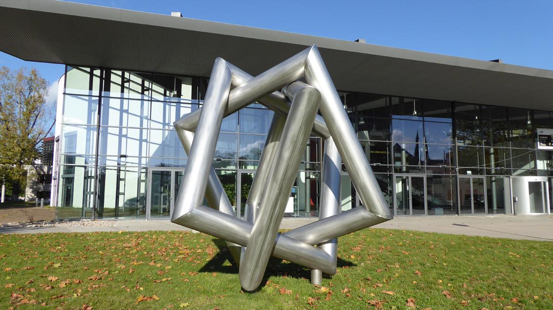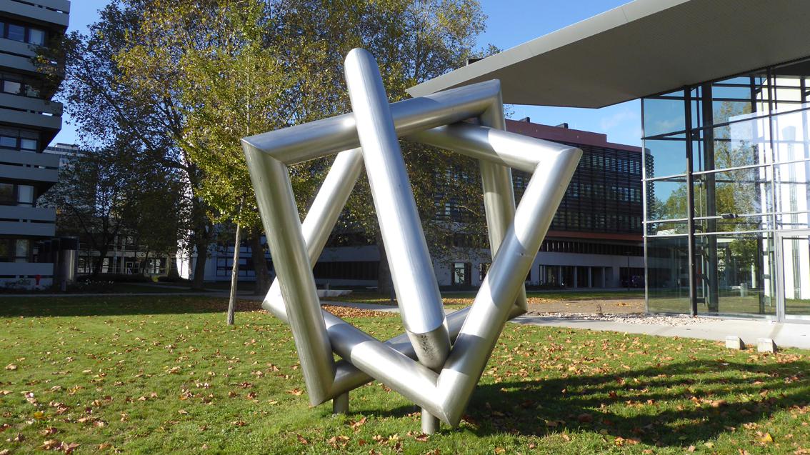 Bei der ‚Triade‘ des emeritierten Professors und ehemaligen Leiters der Technischen Mechanik an der Fakultät für Maschinenbau am KIT durchdringen sich drei Rahmen aus hochglanzpolierten Edelstahlrohren. Die auf der Grundlage einer mathematischen Formel geschaffene Plastik symbolisiert zeichenhaft die Verbindung von Technik, Mathematik und Kunst.