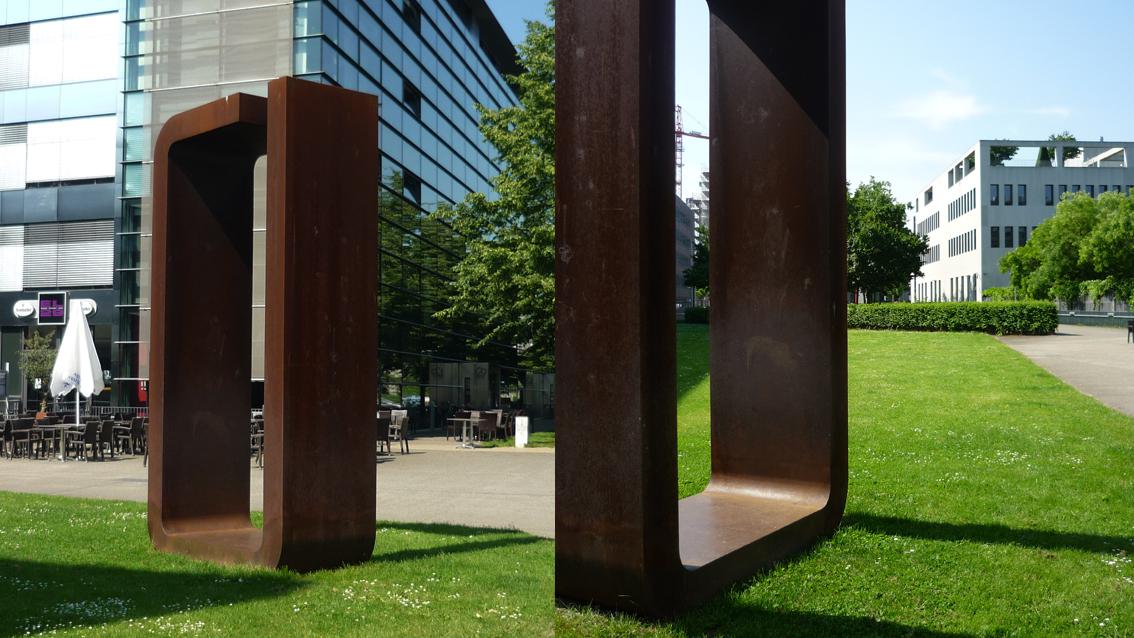 Der Bildhauer unterrichtete an der Staatlichen Akademie der Bildenden Künste in Karlsruhe. Die Stahlarbeit des japanischen Künstlers, der primär in Stein arbeitete, entstand in enger Zusammenarbeit mit der Werft in Speyer. Typisch für Akiyama ist das Motiv ‚Rahmen‘. Bei ‚Von Hier‘ bildet eine klar konturierte Form mit abgerundeten Kanten einen oben offenen Rahmen. Ein Stück des Himmels und der näheren Umgebung wird abhängig vom Standort der Betrachter*innen ausschnitthaft hervorgehoben.