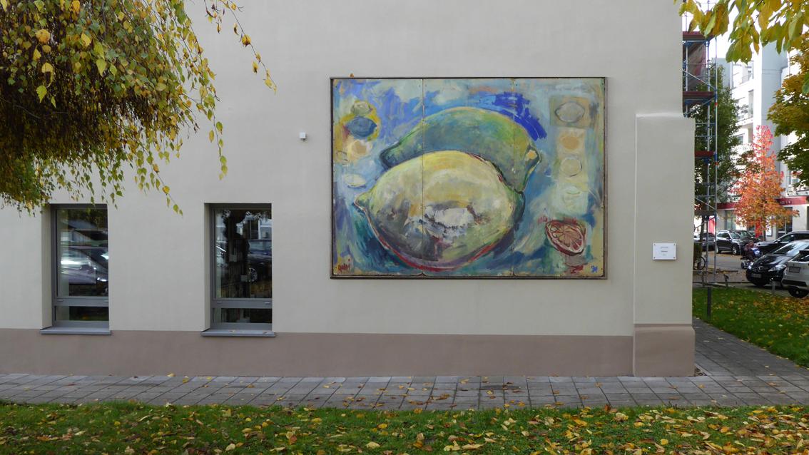Die Malerin ist Mitglied des eingetragenen Vereins: Plakat Wand Kunst. Seit Jahren ist diese Gruppe in der Stadt Karlsruhe, in der Region und darüber hinaus mit temporären Aktionen im öffentlichen Raum aktiv. Verbindendes Konzept ist, dass die individuellen, künstlerischen Ideen auf Holzplatten und in dem Format 260 cm auf 360 cm verwirklicht werden. Die Träger der Raumfabrik haben Werke einzelner Künstler*innen der Gruppe in den vergangenen Jahren erworben und an verschiedenen Stellen der Gebäude des Anwesens fest installiert. Die Arbeit von Gabi Streile ist bestimmt von großen malerischen Gesten, die in der Tradition des gegenständlichen wie dem abstrakten Expressionismus stehen. Aus der Ferne betrachtet ist der Bildgegenstand gut zu erkennen, von nahem wahrgenommen verselbständigen sich die malerischen Mittel. Gabi Streile wurde im Jahre 1950 in Karlsruhe geboren. Zwischen 1970 und 1976 studierte sie an der Staatlichen Akademie der Bildenden Künste bei den Professoren Klaus Arnold, Peter Dreher, Harry Kögler und Franz Bernhard.
