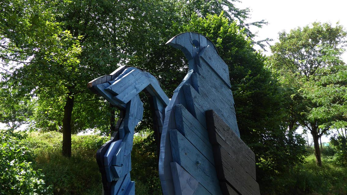 Auf dem Skulpturenpfad zwischen Grünwettersbach und Palmbach befinden sich zwei großformatige Vogelreliefs, die der Künstler zu einer den Ort prägenden, skulpturalen Installation fügte. Einfache Formen und unspektakuläre Farben verbinden sich im Einklang mit der Natur zu einem zeichenhaften und ausdruckstarken Kunstwerk. Die Arbeit 'Zwei Vögel' wurde um 1998 entworfen, war einige Jahre in Privatbesitz, bis sie 2009 im Skulpturenpark aufgestellt wurde. Georg Schalla wurde im Jahre 1947 in Müncheln/Geiseltal (Sachsen-Anhalt) geboren. Nach einer Ausbildung zum Schriftenmaler und Lackierer arbeitete er einige Jahre als Theatermaler am Badischen Staatstheater Karlsruhe. Zwischen 1970 und 1977 studierte er an der Staatlichen Akademie der Bildenden Künste Karlsruhe.